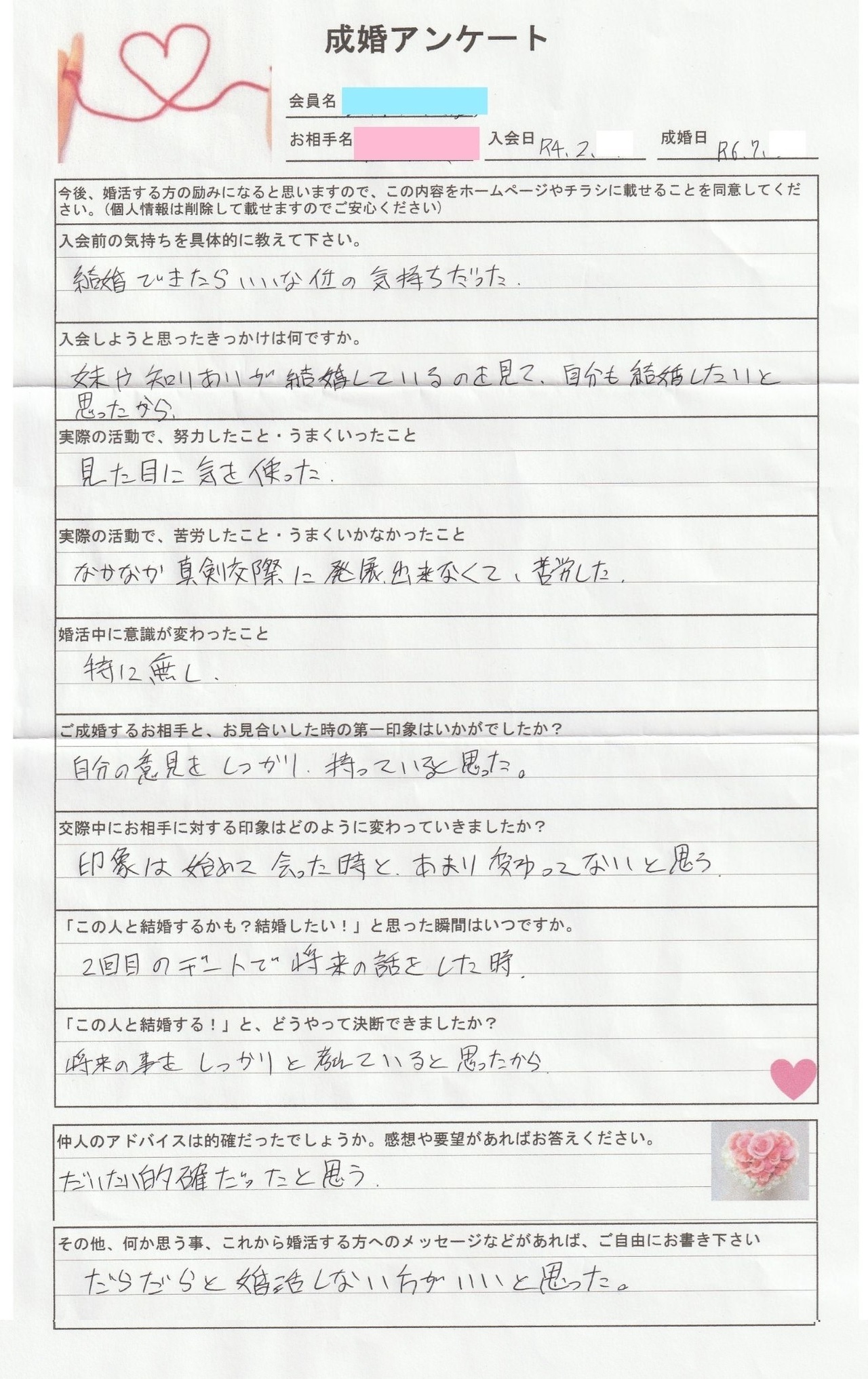 お見合い:2024年4月 ご成婚:2024年7月(入籍同年9月)