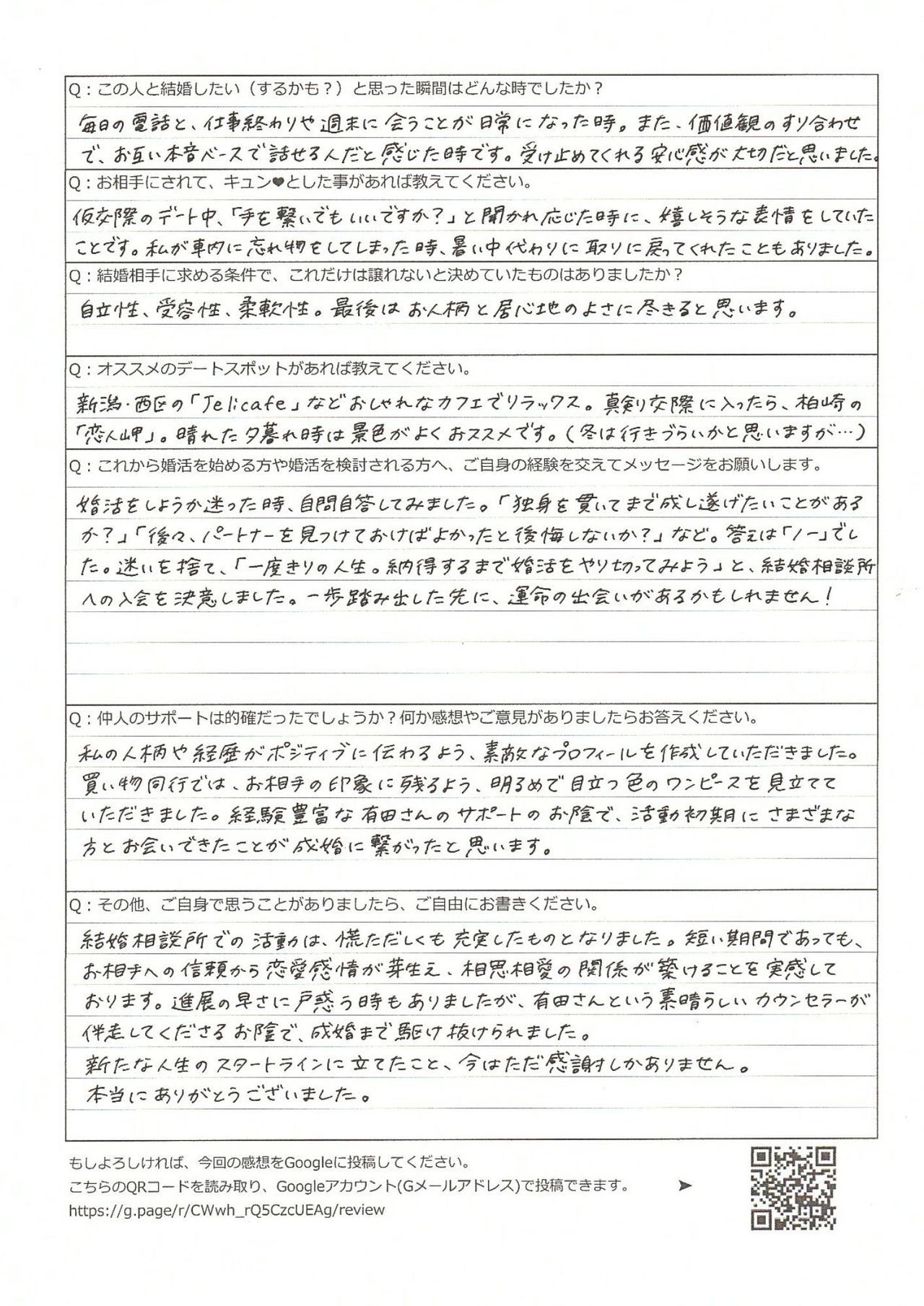 最後に、結婚相談所ハピマリ新潟のサポート体制や仲人の有田に対する評価も、