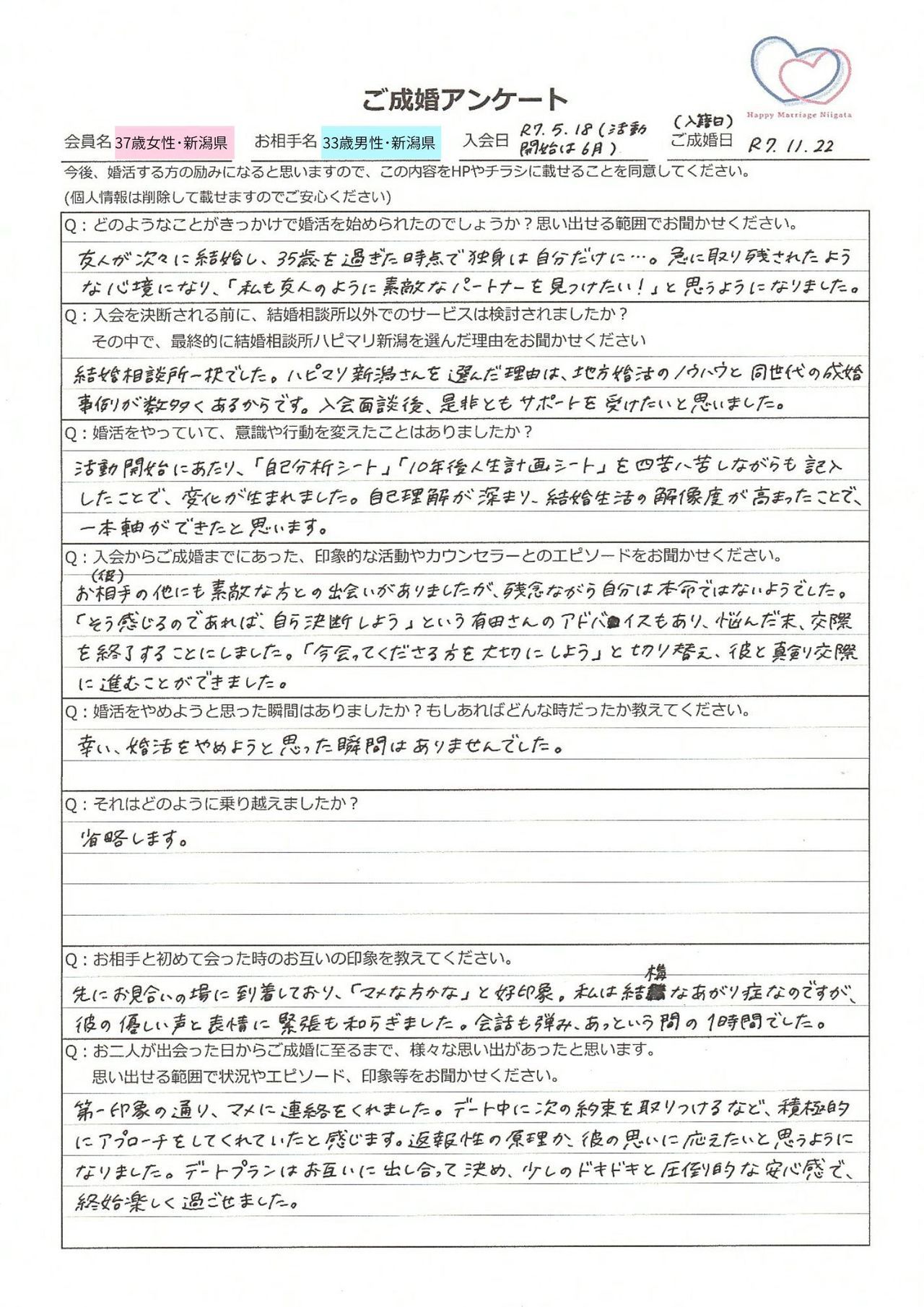 A:結婚相談所一択でした。ハピマリ新潟さんを選んだ理由は、地方婚活のノウハウと同世代の成婚事例が数多くあるからです。入会面談後、是非ともサポートを受けたいと思いました。