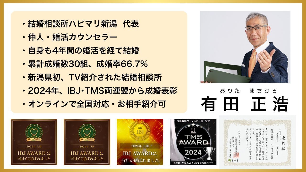 全国対応もオンラインで可能な、結婚相談所ハピマリ新潟の仲人・有田です。